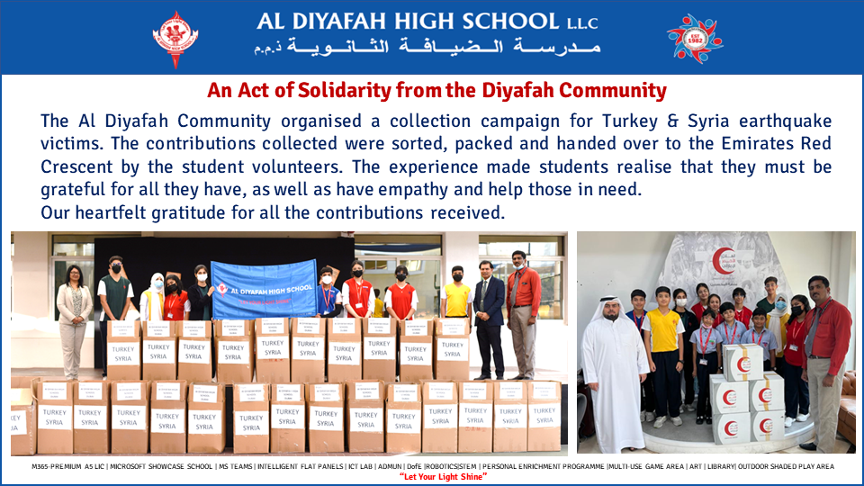 At Al Diyafah High School LLC, we strongly believe in Holistic Education. In today’s world we need to prepare our students to tackle future challenges firmly by nurturing students in all spheres of life.